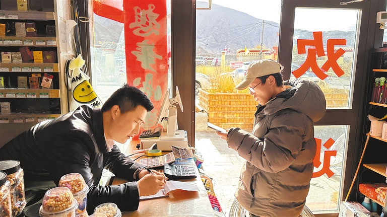 圖為多瑪鄉(xiāng)商戶劉世鵬(左)在為購物者結(jié)賬。記者 婁夢琳 攝