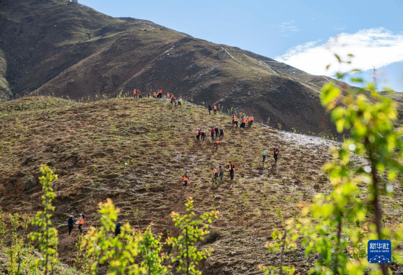 資料圖片:工人們?cè)诶_市城關(guān)區(qū)次角林村附近的山上播種造林