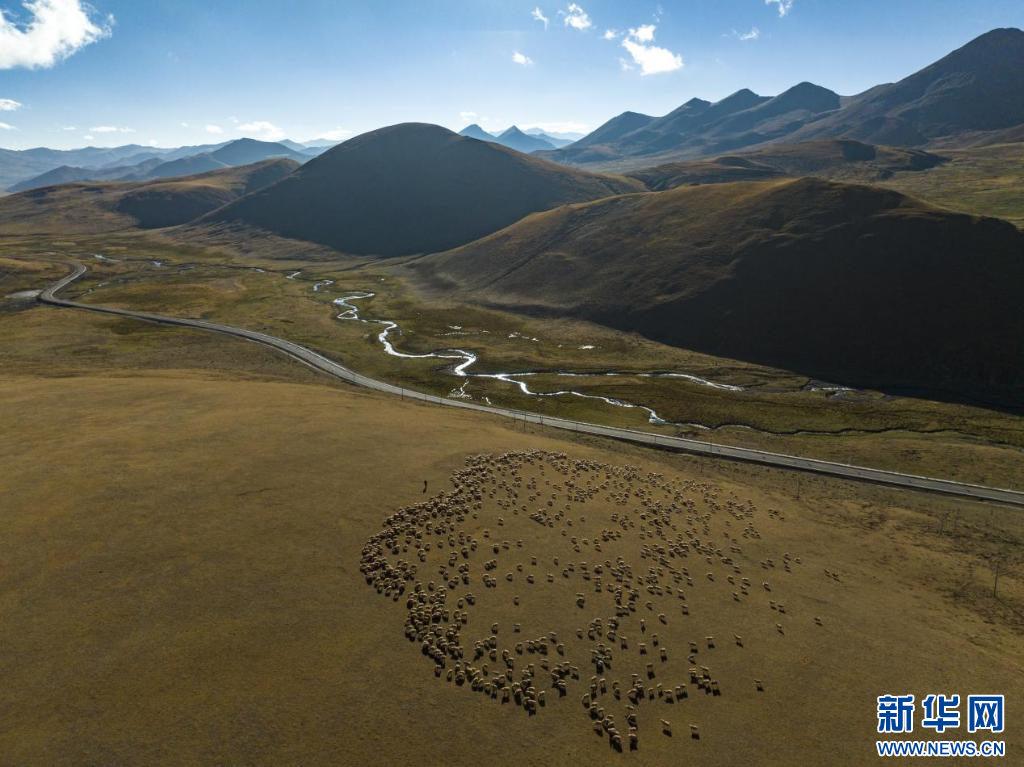 扎西松多村集體養(yǎng)殖的千只綿羊(無人機(jī)照片)。新華網(wǎng) 旦增努布 攝