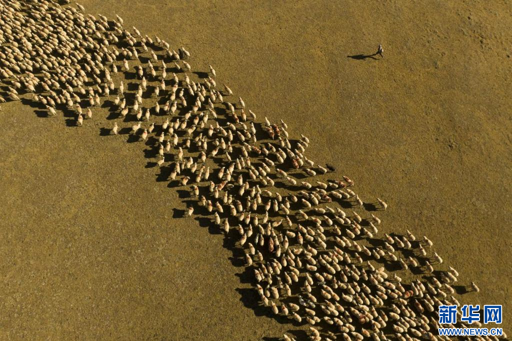 在西藏措美縣境內(nèi)拍攝的羊群(無人機(jī)照片)。新華網(wǎng) 旦增努布 攝