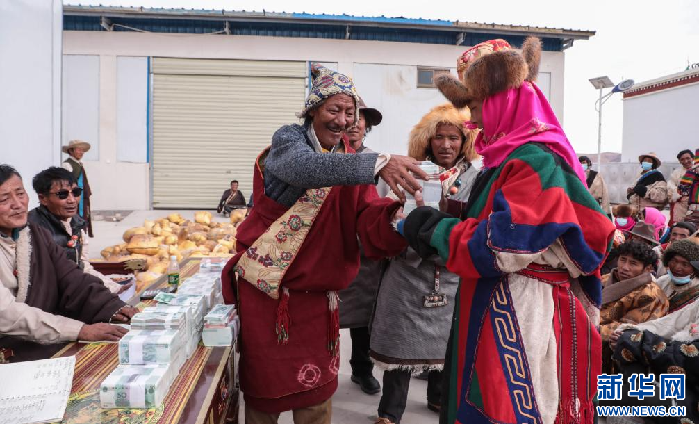 合作社為社員發(fā)放現(xiàn)金分紅(11月28日攝)。新華社發(fā)(索朗仁青 攝)