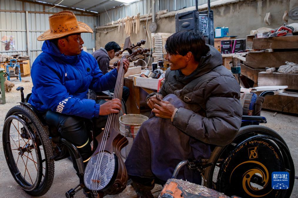 覺列(左)與制作扎念琴的工人交流(12月1日攝)。新華社記者 姜帆 攝