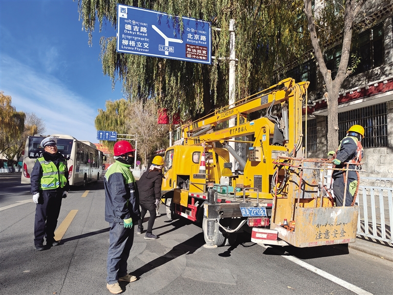 為消除安全隱患,營造安全、整潔的道路環(huán)境,拉薩市公安局交警支隊組織協(xié)調(diào)園林部門工作人員,對遮擋紅綠燈的樹枝進行清理修剪?!芭c交警部門協(xié)調(diào)后,為更好地開展城鄉(xiāng)環(huán)境綜合整治行動,讓廣大司機出行更加方便,我們對遮擋信號燈、標識標牌的樹木進行了修剪。”拉薩城關(guān)區(qū)潔達園林綠化投資工程有限公司二分公司負責(zé)人巴桑次仁說。