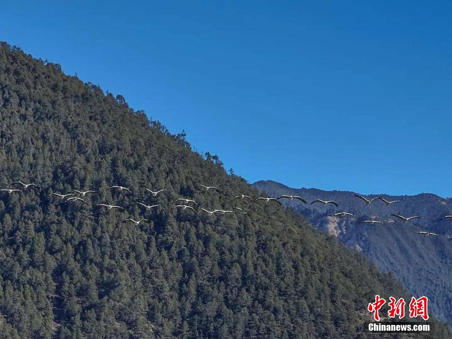 圖為黑頸鶴在雅魯藏布江上空飛舞。袁相普 攝