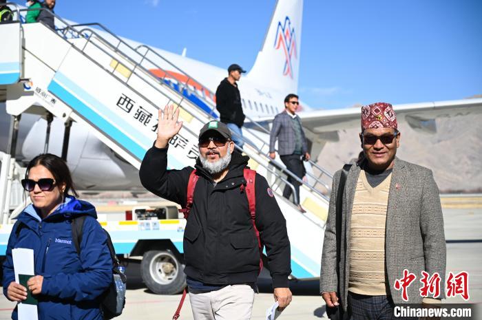 12月28日,從尼泊爾加德滿都抵達(dá)拉薩貢嘎國際機(jī)場(chǎng)的旅客。中新社記者 趙朗 攝
