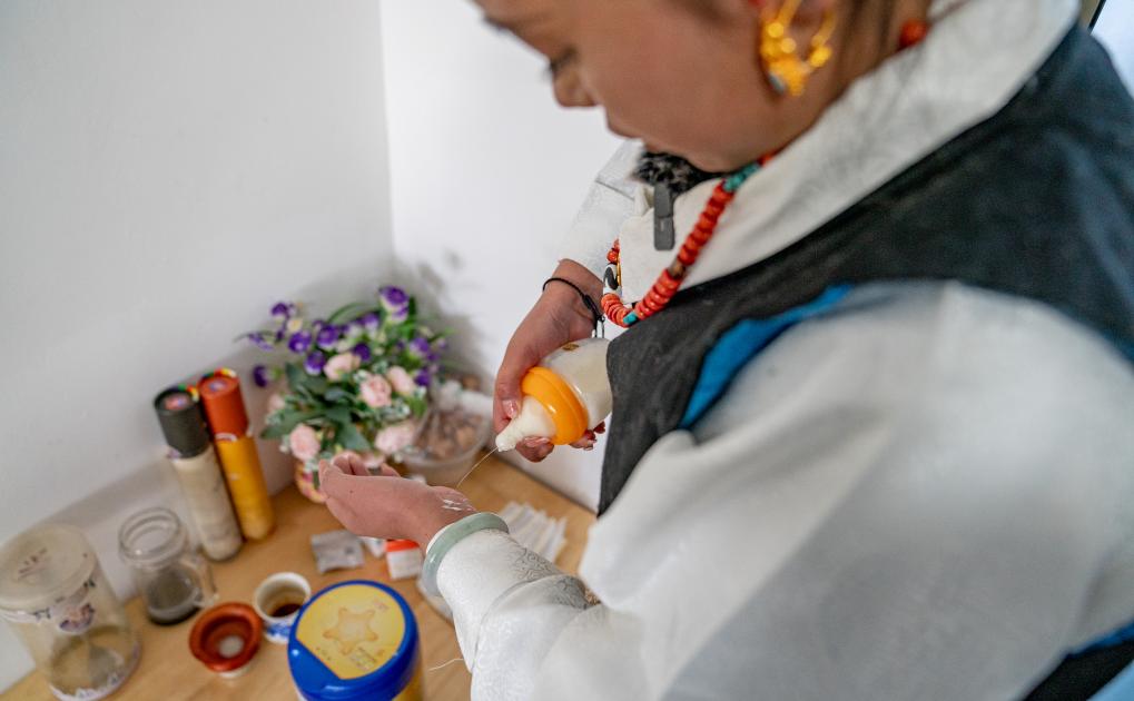 1月8日,愛心媽媽旦增卓瑪給孩子沖奶粉時試溫。新華社照片,拉薩,2024年1月9日 新華社發(fā)(丁增尼達攝)