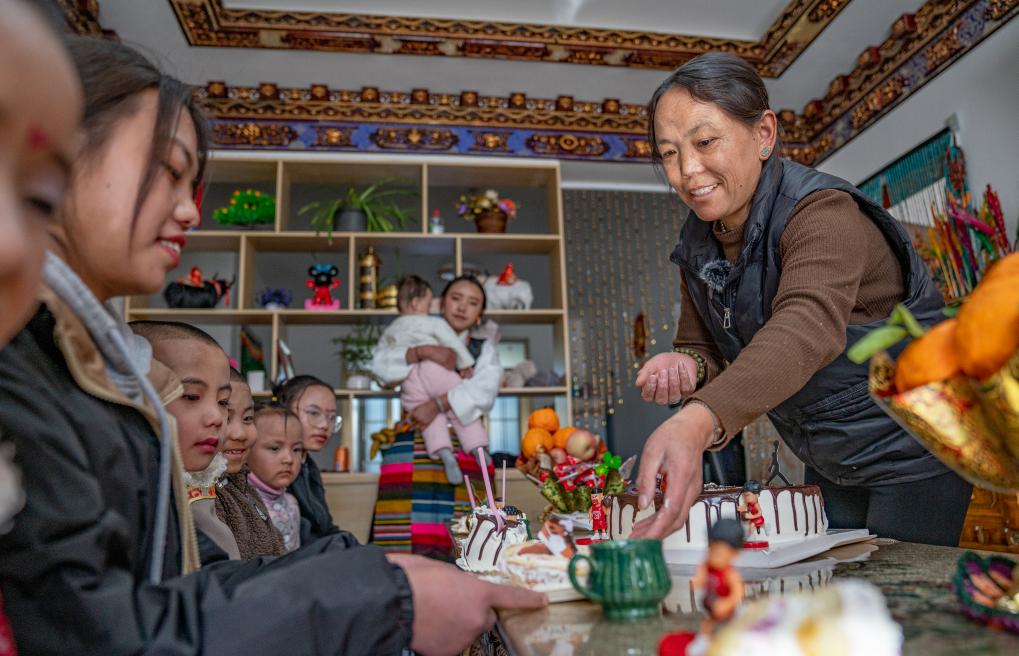 1月8日,愛心媽媽巴桑給孩子們分發(fā)蛋糕。新華社照片,拉薩,2024年1月9日 新華社發(fā)(丁增尼達攝)