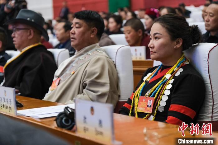 1月9日,西藏少數(shù)民族界政協(xié)委員、墨脫縣達(dá)木珞巴民族鄉(xiāng)鄉(xiāng)長(zhǎng)布姆曲珍(右一)在西藏自治區(qū)兩會(huì)現(xiàn)場(chǎng)。中新社記者 江飛波 攝