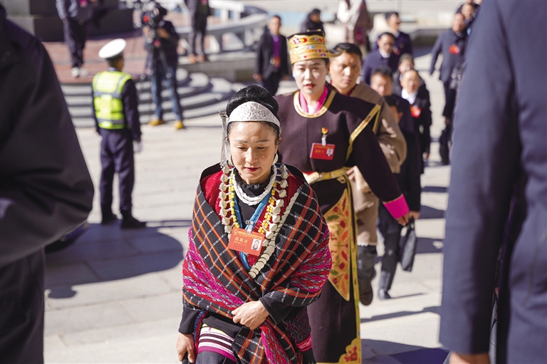 身著民族服飾的人大代表步入閉幕會場。