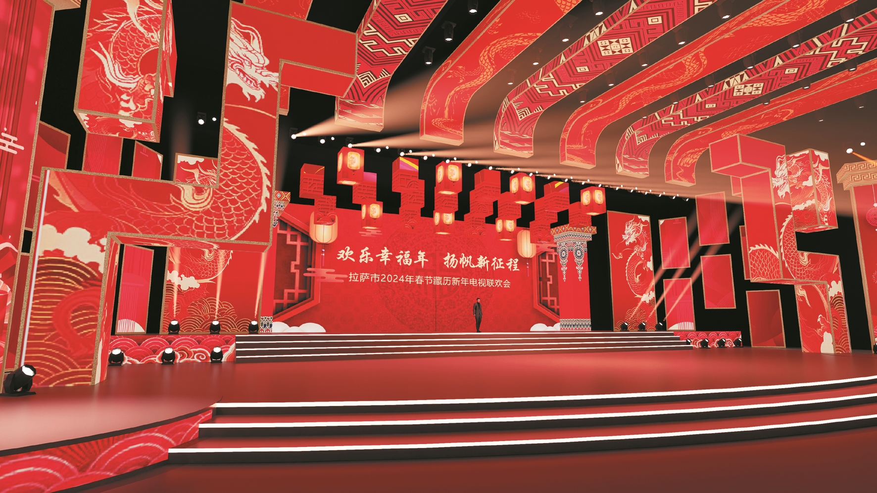 拉薩市2024年春節(jié)、藏歷木龍新年電視聯(lián)歡會(huì)舞臺效果圖。 (拉薩藏晚劇組供圖)