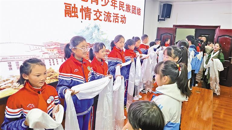 圖為洛扎縣的同學們向華夏方圓學校學生敬獻哈達。記者 武沛濤 攝