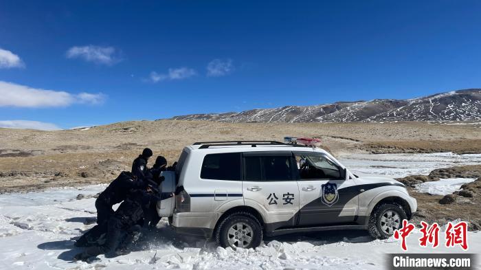 圖為移民管理警察正在齊心協(xié)力使車(chē)輛脫困。謝牧 攝