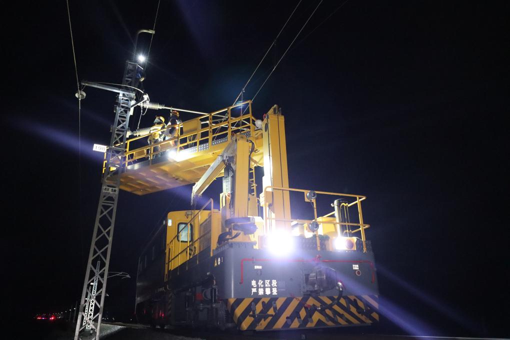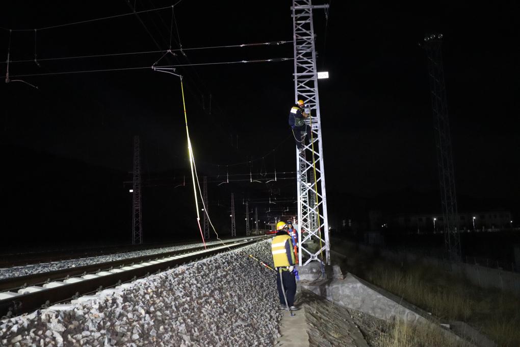 維護(hù)進(jìn)行時(shí),專用的接觸網(wǎng)軌道作業(yè)車(chē)的兩節(jié)車(chē)廂緩緩解列,分別駛向全長(zhǎng)13公里的接觸網(wǎng)作業(yè)區(qū)段兩端。拉薩的冬夜寒風(fēng)刺骨,溫度低至零下10攝氏度,工人們穿著絕緣鞋,將兩端接觸網(wǎng)接掛地線,正式開(kāi)始作業(yè)。