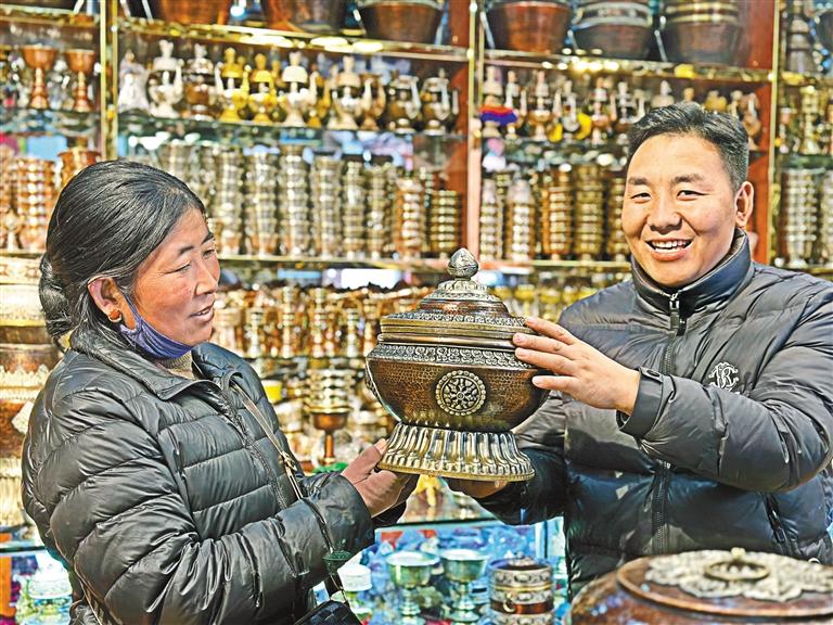 新年前夕,切瑪盒攤位的生意特別好?!敖衲曩I了新房,想購買一個新的切瑪盒,母親喜歡純色,我們年輕人喜歡彩繪的,不過價格都特別實惠,我們再商量商量。”市民次仁雍措樂呵呵地說道。