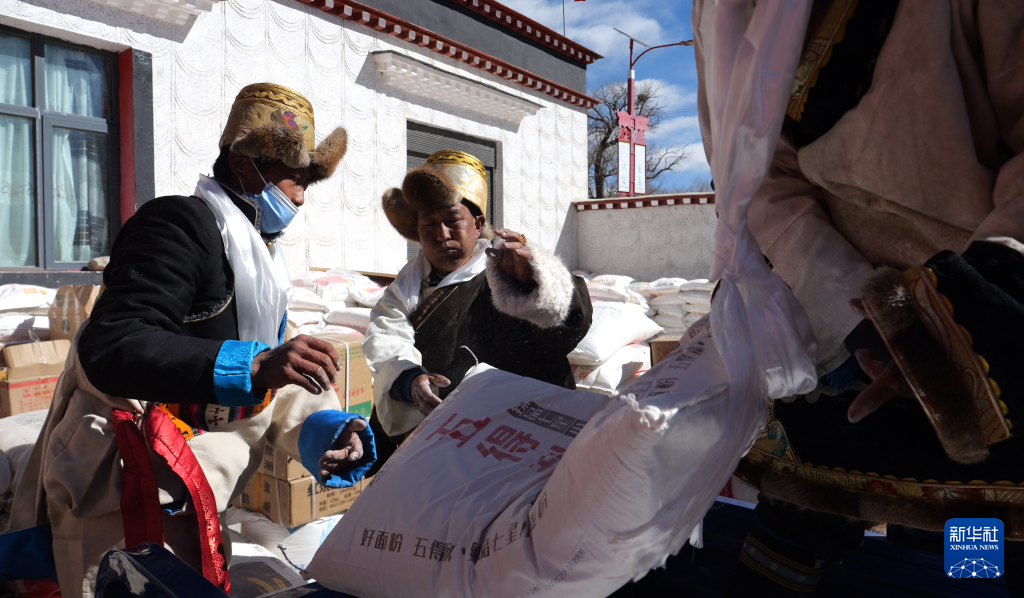 2月3日,努堆村2023年分紅大會現(xiàn)場,村民們在將分紅物資搬運(yùn)上車。新華社記者 格桑朗杰 攝