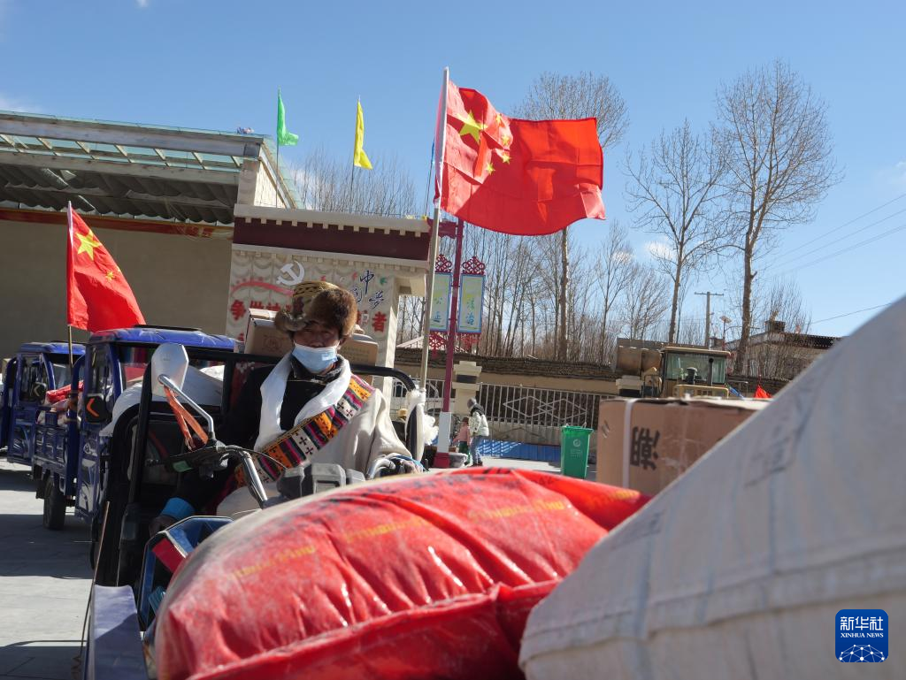 2月3日,努堆村2023年分紅大會現(xiàn)場,村民用電動三輪車將分紅物資運(yùn)回家中。新華社記者 洛卓嘉措 攝