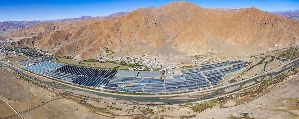 白朗縣日喀則珠峰現(xiàn)代農(nóng)業(yè)科技創(chuàng)新博覽園(無(wú)人機(jī)拼接照片,2023年5月28日攝)。新華社記者 姜帆 攝