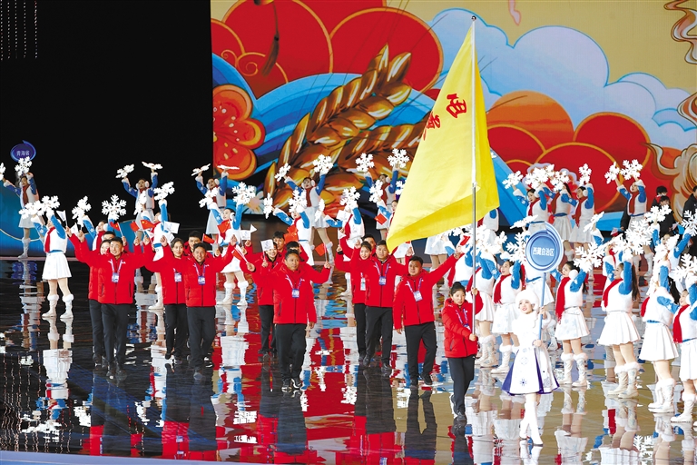 圖為西藏代表團(tuán)亮相第十四屆全國(guó)冬季運(yùn)動(dòng)會(huì)開幕式。洛桑 索朗群培 攝