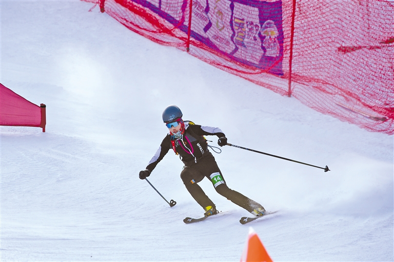 此次比賽共有兩條賽道,呈字母Y形,賽道全長(zhǎng)1100米,累計(jì)爬升130米。選手們分別需要完成兩次穿板上升、轉(zhuǎn)換下滑,然后在接力區(qū)身體觸碰完成接力,比賽充滿挑戰(zhàn)。