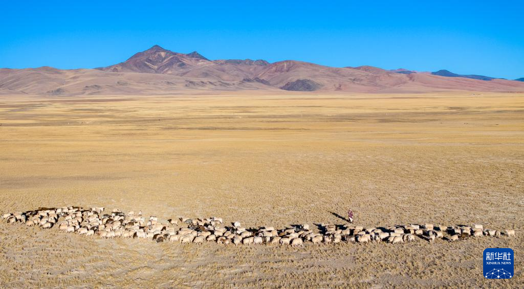 丹增在尼瑪縣俄久鄉(xiāng)馬遷村老家的草場上牧羊(無人機(jī)照片,2023年12月18日攝)。新華社 姜帆 攝