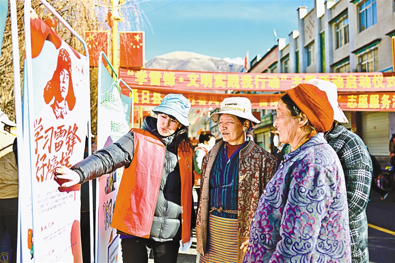圖為在桑日縣“學(xué)雷鋒·文明實(shí)踐我行動(dòng)”主題活動(dòng)啟動(dòng)儀式現(xiàn)場(chǎng),志愿者向過往群眾講解雷鋒精神。記者 丹增平措 攝