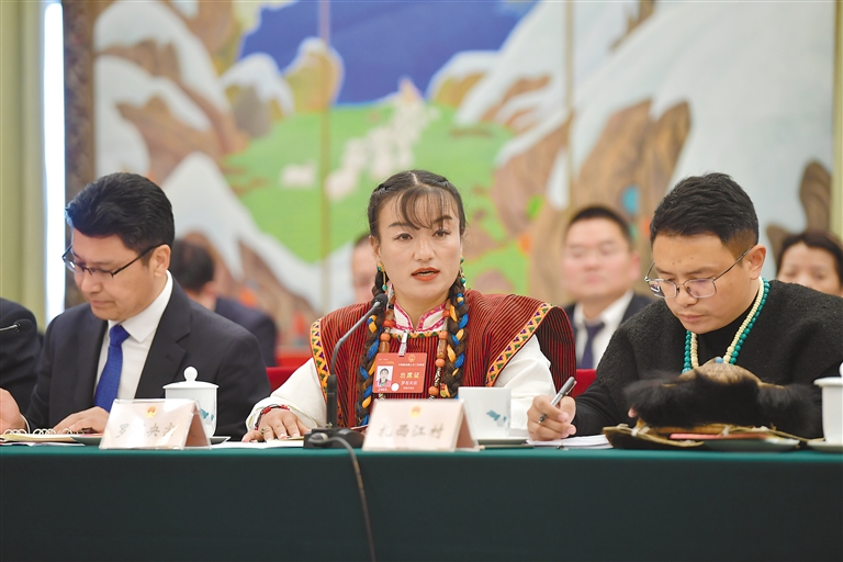 圖為3月6日上午,西藏代表團舉行全體會議,傳達學(xué)習(xí)習(xí)近平總書記在參加江蘇代表團審議時的重要講話精神,繼續(xù)審議政府工作報告,審查計劃報告和預(yù)算報告。圖為全國人大代表扎西尼瑪(中)在會上發(fā)言。