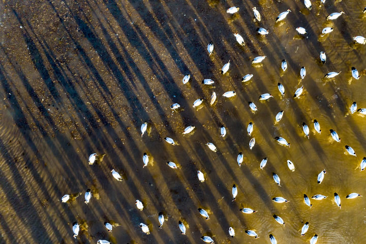 這是2023年12月5日清晨在拉薩市林周縣虎頭山水庫拍攝的越冬黑頸鶴(無人機(jī)照片)。新華社記者 姜帆 攝