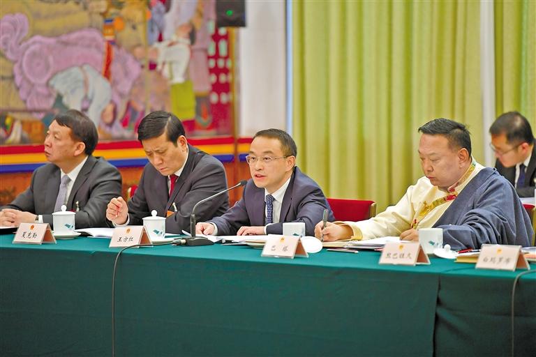圖為西藏全國(guó)人大代表王方紅(右二)在西藏代表團(tuán)全體會(huì)議上發(fā)言。