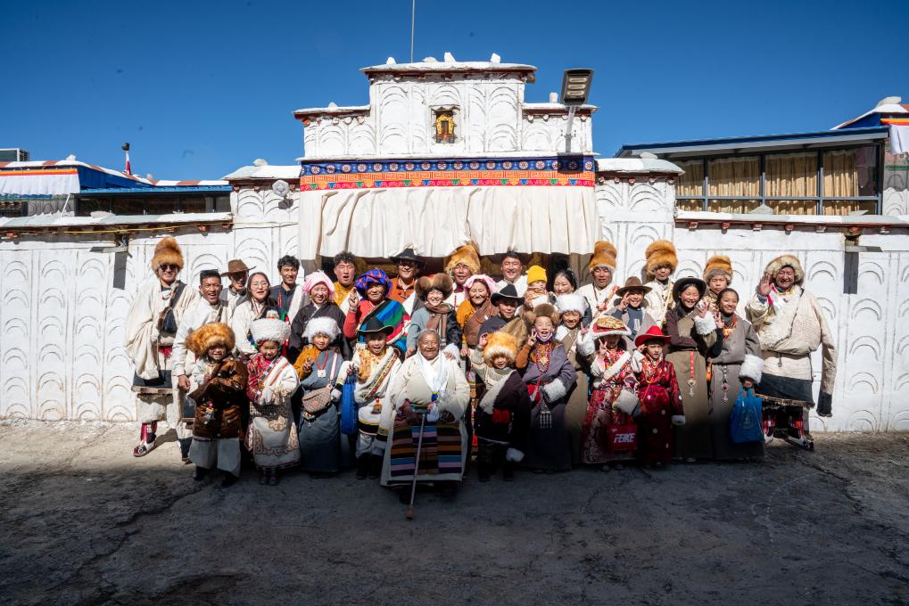 在西藏拉薩市當雄縣公塘鄉(xiāng)甲根村,斯曲旺姆(前中)和家人們一起拍攝全家福(2月10日攝)。新華社記者 丁增尼達 攝