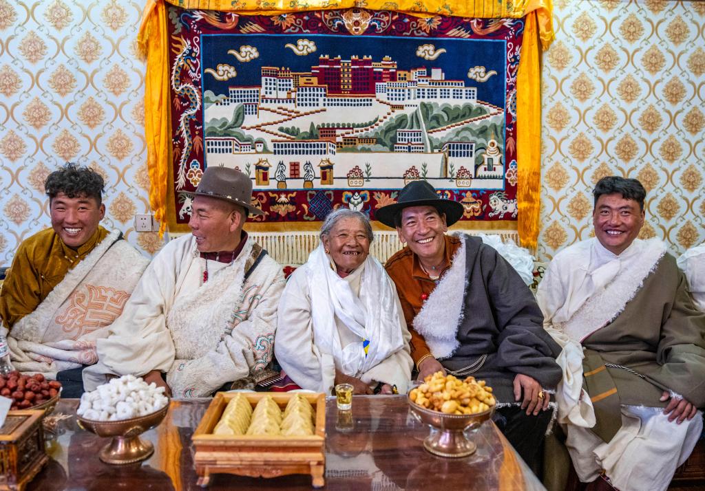 今年藏歷新年,斯曲旺姆的兒女們帶著各自的小家庭來甲根村團聚。孩子們依次給老人獻上哈達,敬上青稞酒,被圍坐在中間的斯曲旺姆,身邊滿是歡聲笑語。