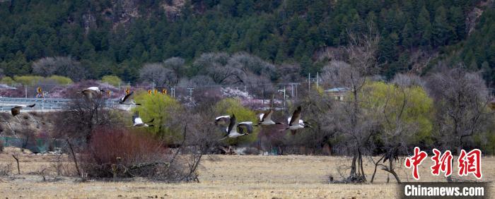 圖為桃花前飛翔的黑頸鶴。貢嘎來松 攝
