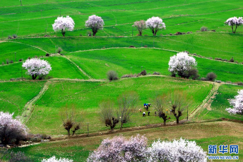 圖為西藏波密縣傾多鎮(zhèn)巴康村內,桃花映襯下的綠草。新華網(wǎng)發(fā) 阿旺仁青 攝