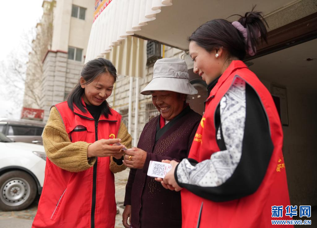 4月2日,納金村居民和工作人員為網(wǎng)格便民二維碼點贊。(新華社記者 晉美多吉 攝)