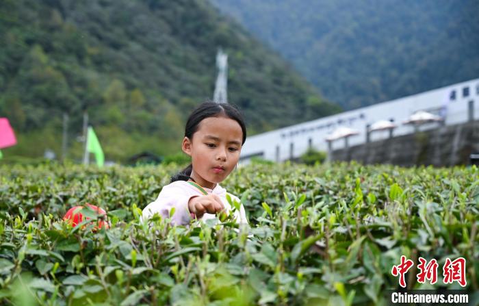 圖為一名小女孩體驗采茶。趙朗 攝
