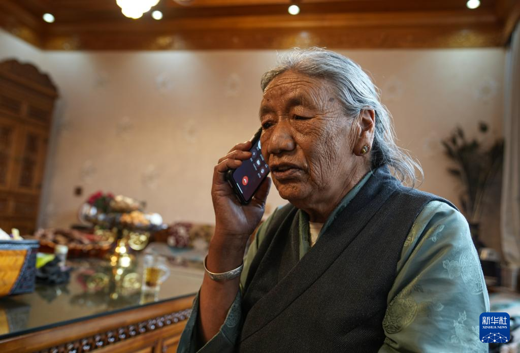 格桑玉珍用手機(jī)與好友通話(4月3日攝)。新華社記者 晉美多吉 攝