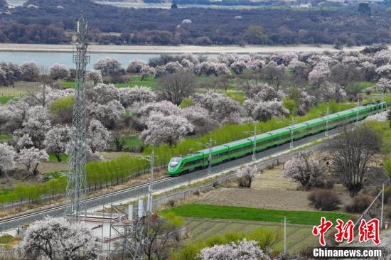 復(fù)興號(hào)動(dòng)車(chē)組不僅是一種便捷的交通方式,更成為了一種獨(dú)特的旅游體驗(yàn),讓游客能夠近距離欣賞到西藏林芝春季獨(dú)特的自然美景。圖為穿梭在桃花林中的拉林鐵路高原復(fù)興號(hào)。