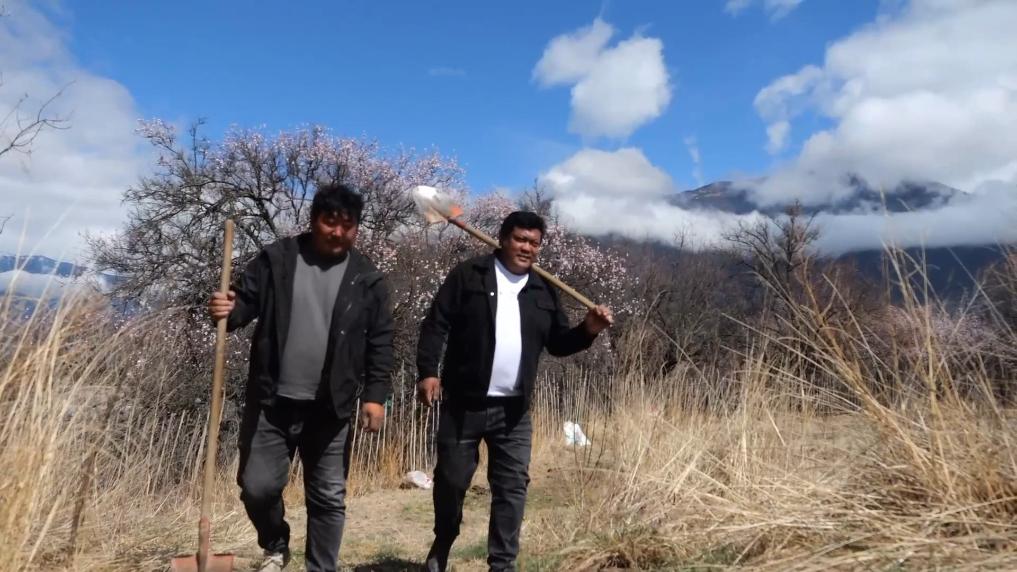 早春,雪域高原逐漸從寒冬中復(fù)蘇。西藏林芝的山林之中,桃花如云霞般綻放。一片芳菲景象中,新一年的生機(jī)與繁榮正在孕育。這天一早,羌渡崗村的兩名干部又一次來(lái)到了他們牽掛的村集體果園,查看長(zhǎng)勢(shì),整理土地。