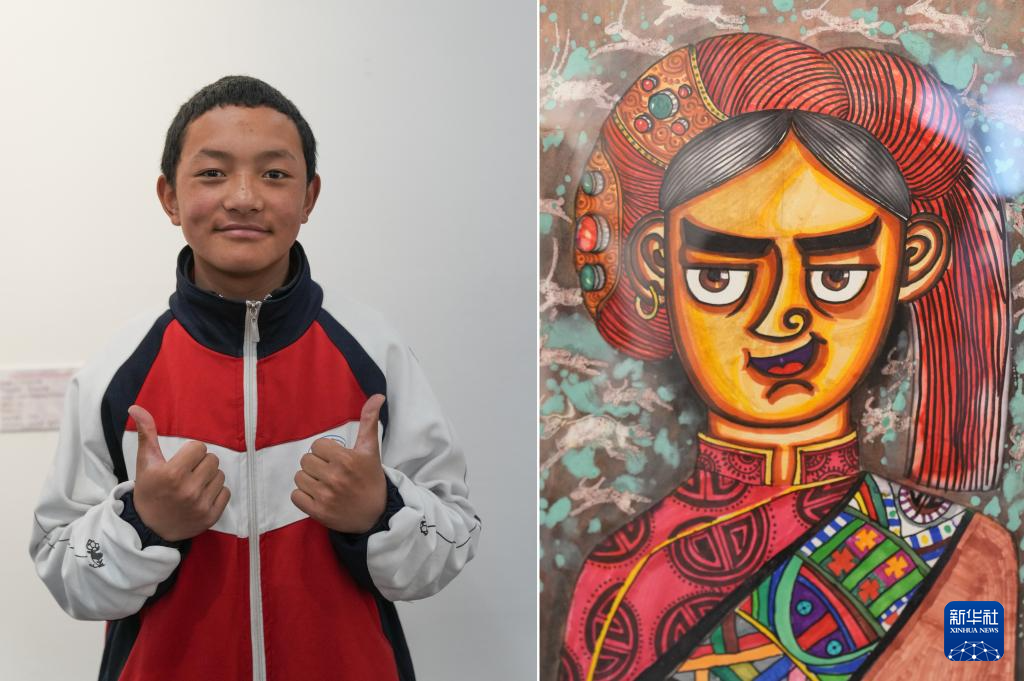 4月19日拍攝的拉薩市特殊教育學校15歲的聽障學生多杰占堆和他的作品《哥的頭像》(拼版照片)。新華社記者 晉美多吉 攝