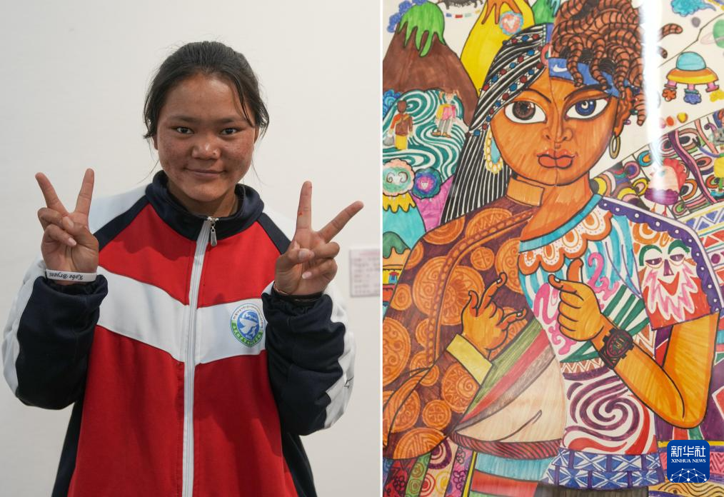 4月19日拍攝的拉薩市特殊教育學校14歲的聽障學生貢覺央吉和她的作品《阿里服飾》(拼版照片)。新華社記者 晉美多吉 攝