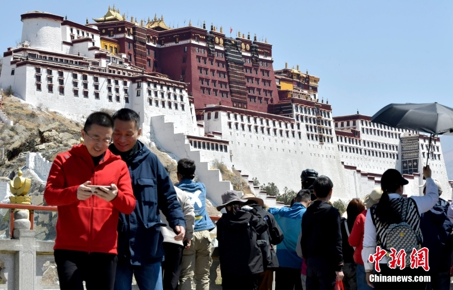 4月23日,游客在拉薩藥王山觀景臺(tái)拍照留念。隨著西藏旅游旺季臨近,中外游客來(lái)到雪域高原觀光旅游。中新社記者 李林 攝