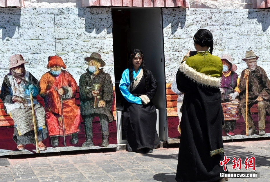 4月23日,身著藏裝的游客在拉薩八廓街拍照留念。隨著西藏旅游旺季臨近,中外游客來(lái)到雪域高原觀光旅游。中新社記者 李林 攝