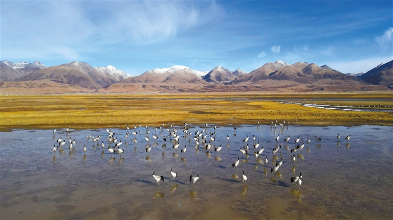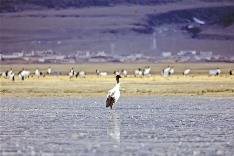 數(shù)量逐年增多的黑頸鶴成群遷徙停歇或繁殖,正是對(duì)當(dāng)雄縣生態(tài)環(huán)境持續(xù)向好的最美注腳。當(dāng)雄縣自然資源局(林業(yè)和草原局)局長(zhǎng)楊光富說:“近年來,當(dāng)雄縣始終堅(jiān)持‘綠水青山就是金山銀山、冰天雪地也是金山銀山’的發(fā)展理念,率先在拉薩市成功創(chuàng)建全國(guó)生態(tài)文明示范縣和‘兩山’實(shí)踐創(chuàng)新基地。這兩塊金字招牌充分體現(xiàn)了當(dāng)雄的生態(tài)底色。下一步,我們將在全縣草原生態(tài)保護(hù)中重點(diǎn)突出阿熱濕地保護(hù),探索濕地黑頸鶴、斑頭雁等珍稀野生動(dòng)物活動(dòng)的特點(diǎn)規(guī)律,促進(jìn)濕地保護(hù)管理與濕地資源合理利用有機(jī)融合,確保探索形成守綠換金、添綠增金、點(diǎn)綠成金的‘兩山’轉(zhuǎn)化模式。”