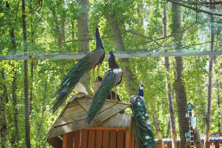 乘著觀光車(chē)前行,一路都被綠葉青草圍繞。觀賞完動(dòng)物,記者一行在動(dòng)物園內(nèi)的餐廳就餐,等待美食的過(guò)程中,點(diǎn)一杯咖啡或甜茶,看著藍(lán)天白云和滿(mǎn)眼綠意,不時(shí)還能聽(tīng)到孔雀啼鳴,別有一番滋味。