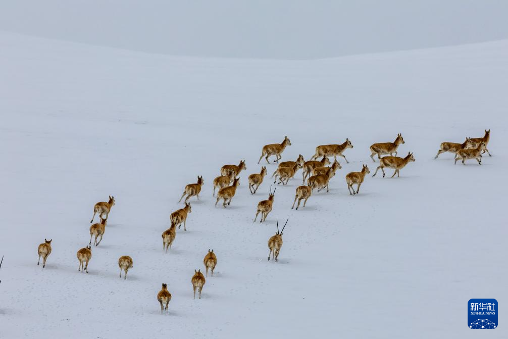 藏羚羊在雪地上奔跑(5月8日攝)。新華社記者 丁增尼達 攝