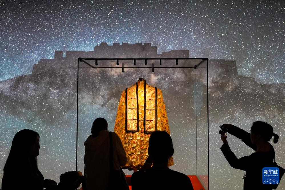5月11日,觀(guān)眾在展出現(xiàn)場(chǎng)參觀(guān)拍攝“金寶地花卉紋斗篷”。新華社記者 李博 攝