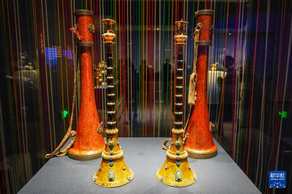 5月11日,“布達(dá)拉宮——來(lái)自雪域的世界文化遺產(chǎn)”展覽現(xiàn)場(chǎng)展出的“藏式嗩吶”。新華社記者 李博 攝