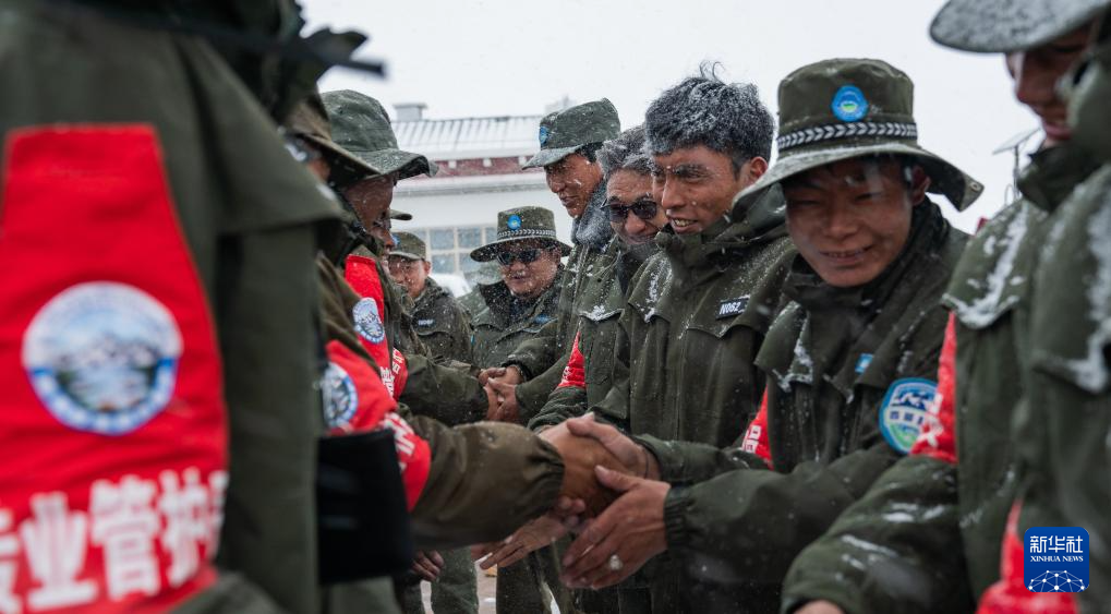 布查玉管護(hù)站的野生動(dòng)物管護(hù)隊(duì)員們熱情歡迎風(fēng)雪中前來(lái)巡護(hù)的同事(5月7日攝)。新華社記者 丁增尼達(dá) 攝