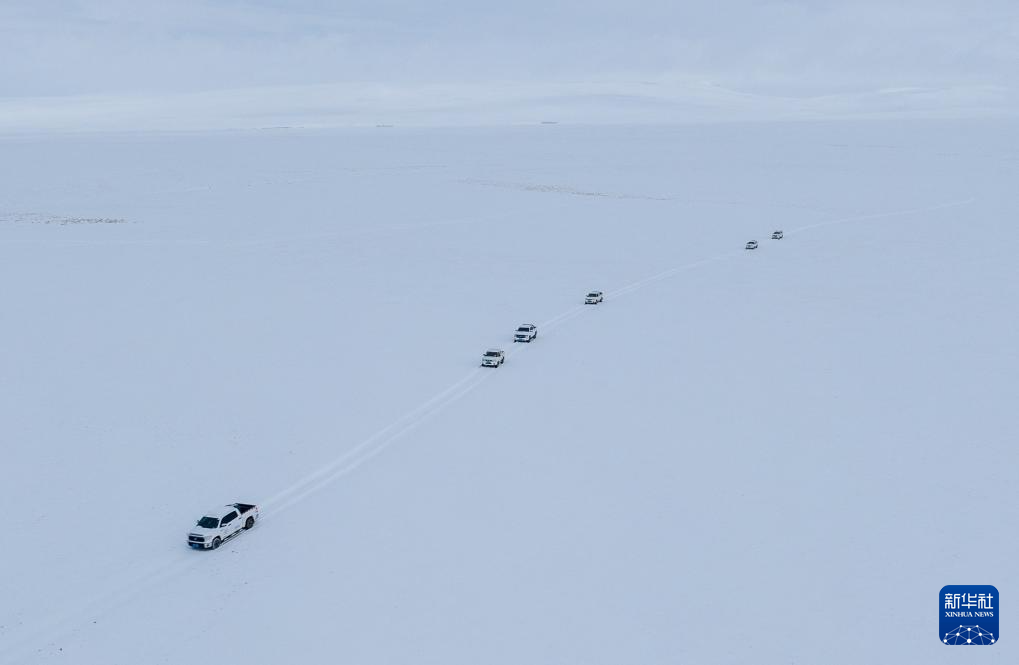 野生動(dòng)物專業(yè)管護(hù)隊(duì)員的車隊(duì)在大雪中巡護(hù)(無(wú)人機(jī)照片,5月8日攝)。新華社記者 丁增尼達(dá) 攝