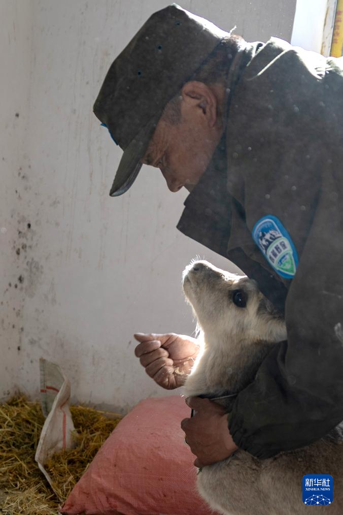 羅布玉杰站的野生動(dòng)物專業(yè)管護(hù)隊(duì)員在出發(fā)巡護(hù)前給站里救護(hù)的受傷藏原羚喂糌粑(5月7日攝)。新華社記者 姜帆 攝