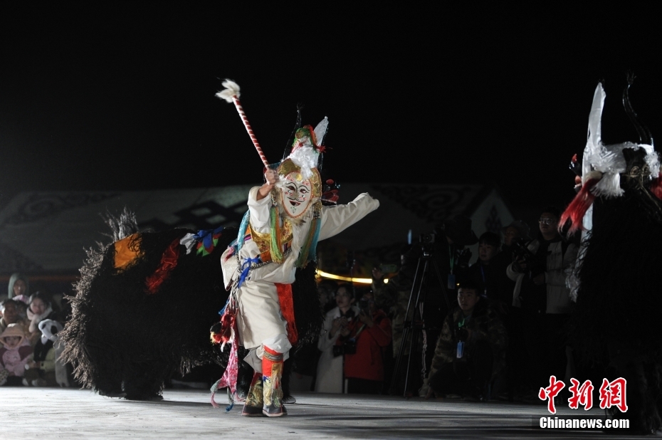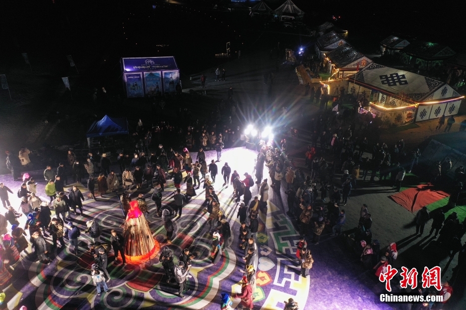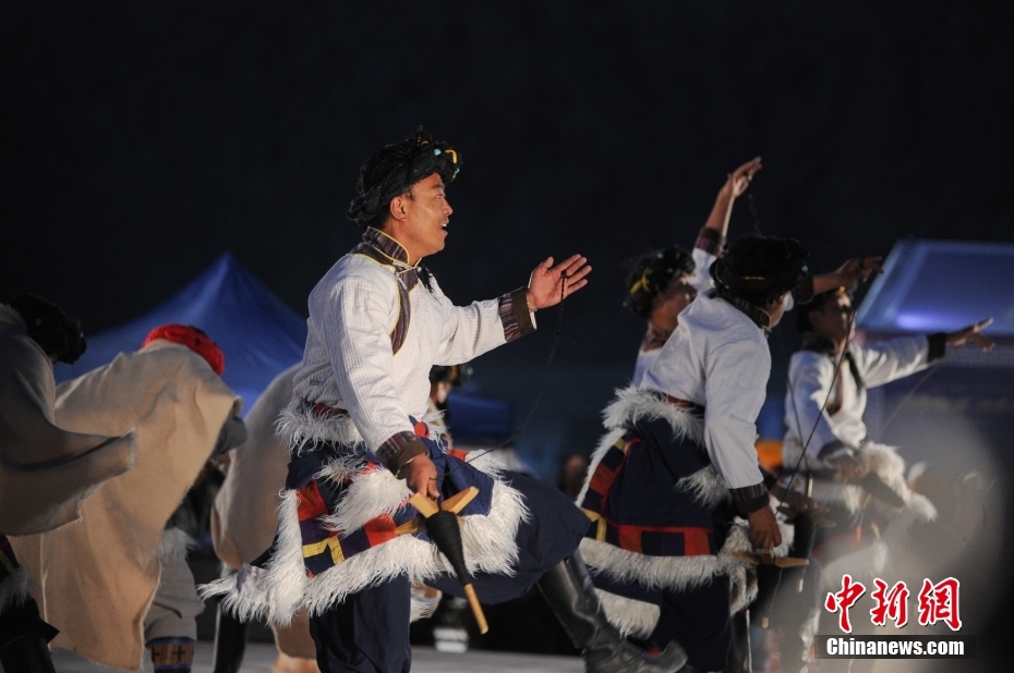 5月18日晚,西藏拉薩市當(dāng)雄縣納木錯(cuò)湖畔,當(dāng)?shù)啬撩駧в慰腕w驗(yàn)篝火鍋莊舞。納木錯(cuò),被譽(yù)為“天湖”,吸引著大量游客前來觀光。圖為篝火鍋莊舞晚會(huì)上的文藝演出。